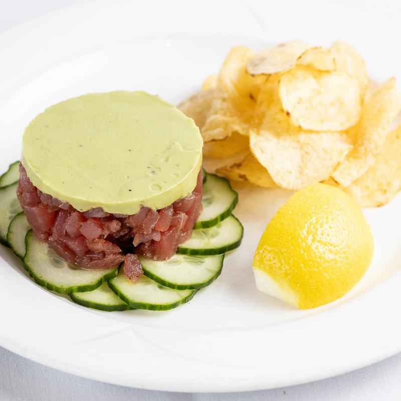 Diced fresh tuna marinated in soy sauce, sliced cucumber and avocado